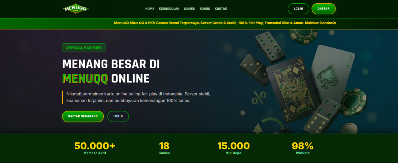 Dalam dunia perjudian kartu daring yang semakin kompetitif, MenuQQ telah mengukuhkan posisinya sebagai destinasi utama dan paling aman bagi para penggemar taruhan uang asli di Indonesia. Sebagai situs QQ terpercaya, platform ini menawarkan akses tanpa batas ke berbagai permainan klasik yang sangat diminati, seperti BandarQQ yang memberikan kesempatan unik bagi pemain untuk menjadi bandar, serta DominoQQ yang menuntut ketangkasan strategi tingkat tinggi. Kualitas server grade A yang digunakan menjamin kelancaran setiap putaran meja tanpa gangguan teknis, menjadikan pengalaman bermain PKV Games di sini jauh lebih stabil dan unggul dibandingkan kompetitor lainnya. Keamanan data privasi member dan proses transaksi perbankan yang cepat menjadi prioritas mutlak, memastikan bahwa setiap pemain dapat menikmati sensasi taruhan QQ Poker dengan rasa aman, nyaman, dan penuh percaya diri setiap harinya.
